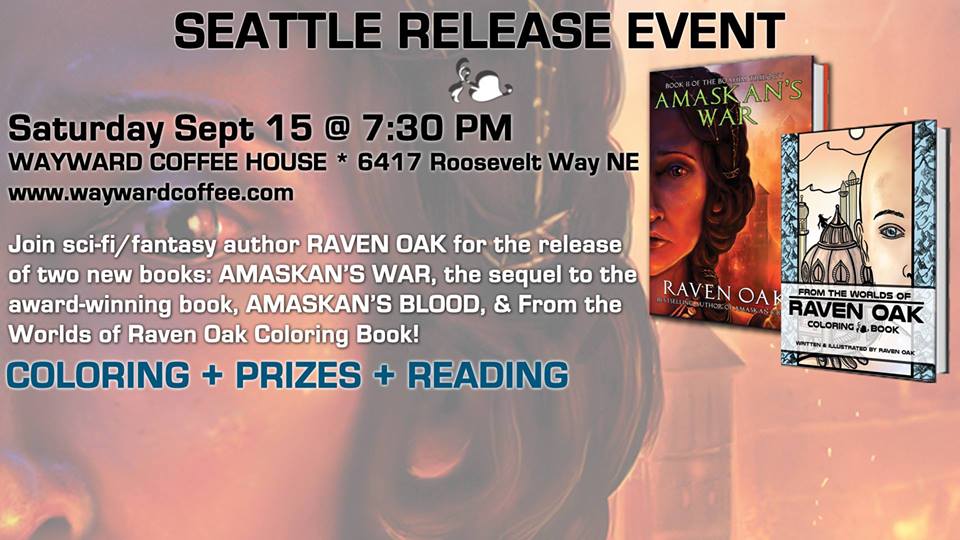 Join sci-fi/fantasy author Raven Oak on Sat, 9/15, at 730 pm, for the release of two new books: Amaskan’s War, the sequel to the award-winning book, Amaskan’s Blood, and the coloring book From the Worlds of Raven Oak. More information on both books can be found at www.ravenoak.net